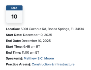 BONITA SPRINGS, FL – With tariffs a major driver of supply chain uncertainty, the construction industry is facing multiple challenges. Matt Moore, co-managing partner of Peckar & Abramson’s Texas offices, will co-present “Managing Risk in an Environment of Supply Chain Uncertainty: Strategies for Navigating Availability, Costs, and Lead Time Challenges” on the middle day of CSC. Third Thursday sat down with Moore to get a preview of a particularly prescient educational session.
